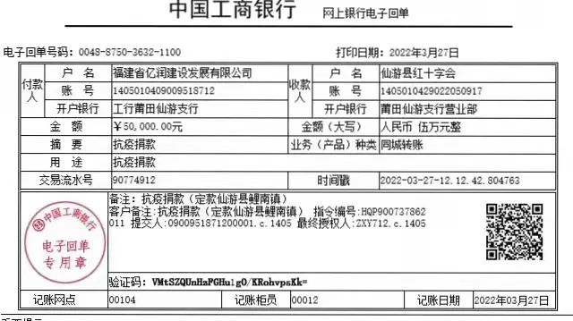 仙游县人大常委会委员、福建省亿润建设发展有限公司董事长曾文山通过县红十字会捐赠人民币5万元,定向用于鲤南镇疫情防控工作。