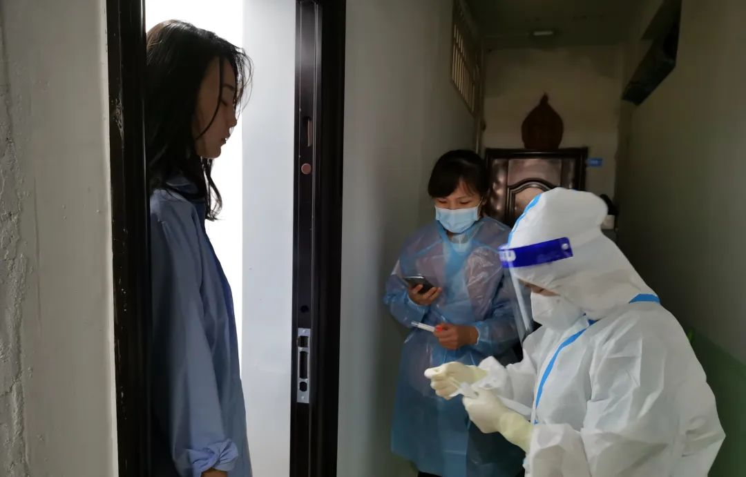 荔城区人大代表、镇海街道文献社区党委副书记宋敏与医护人员一道入户上门为居家隔离人员采集核酸检测样本。