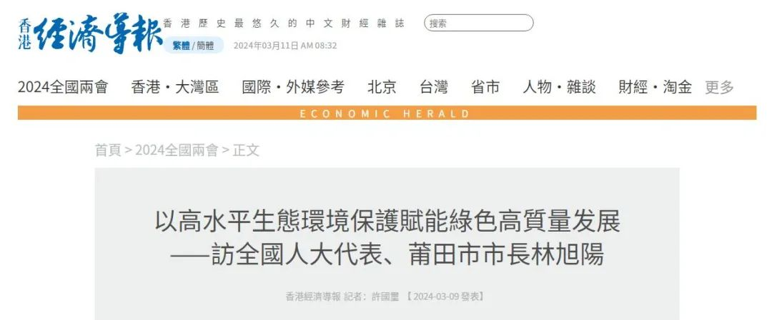 3月9日,《香港经济导报》刊发文章专访全国人大代表、莆田市市长林旭阳全文如下